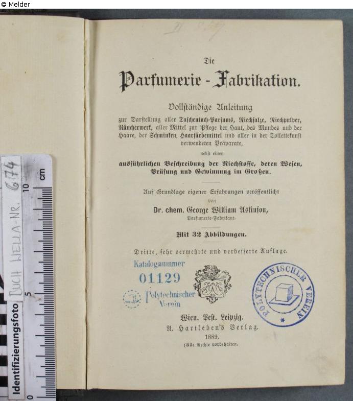 vollständige Anleitung zur Darstellung aller Taschentuch-Parfums, Riechsalze, Riechpulver, Räucherwerk ... ; nebst einer ausführlichen Beschreibung der Riechstoffe, deren Wesen, Prüfung und Gewinnung im Großen, auf Grundlage eigener Erfahrungen