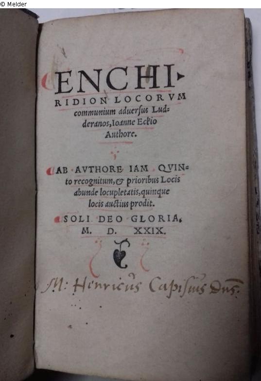Book; paper, printer´s ink, Pigskin binding. H 13,5 cm; W 8 cm. Handwritten in ink: "M. Hinricus Capisius Dus" (old)