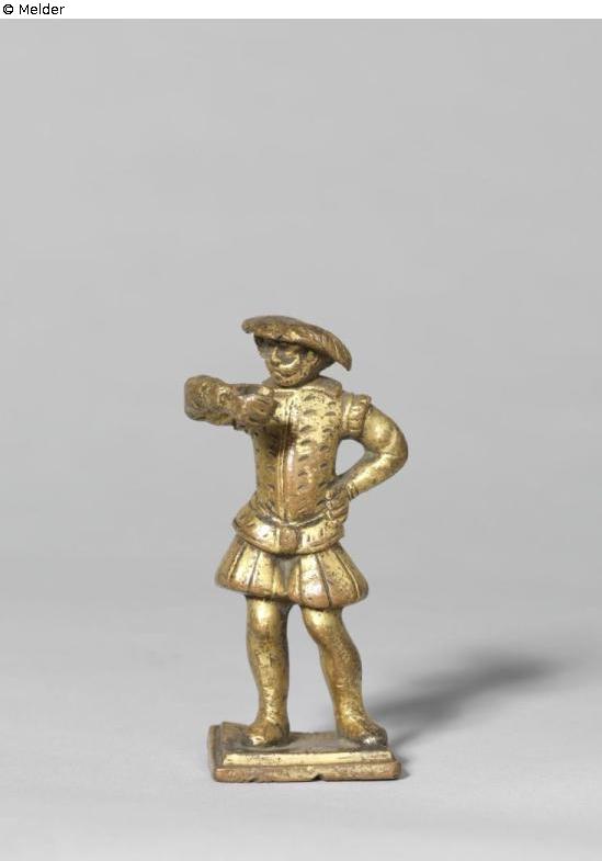 A servant in a bold attitude: the left hand is propped on the hips, the right one bent forward with the lost lance. Clothing: beret with feather, slitjacket, breeches. Rectangular stand. Left front of the lance can be seen. Figure riveted.