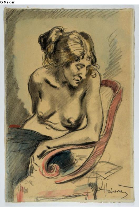 Instcription bottom right: "Habermann". Reverse: label in the middle with number "14" stencilled in blue; typewritten label "F. Gi. H. v. Habermann, Aktstudie, ...". The price "50,-" has been handwritten on the bottom line.