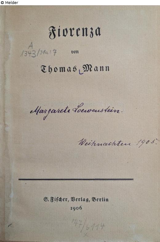 Hardcover, cardboard binding with new flyleaf, 170 pages in Gothic script, remnants of library card, autograph “Margarete Loewenstein. Weihnachten 1905” (Christmas 1905), accession number Leipzig City Library (47/6114), Leipzig City Library stamp.