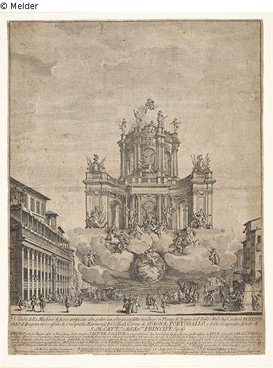 Festive architecture with fireworks in the form of a sacred building with a tambour floating in the clouds, created in 1728 by architect Nicola Salvi. Built above the Barcaccia, Hymeneo (god of wedding ceremonies), Cupid on the globe and Apollo above, surrounded by the nine muses, can be seen in the clouds.