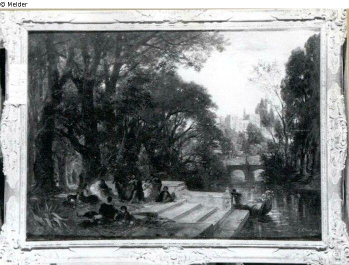 Found-Object Report | Object report Garden party at the Villa d'Este Lost Art-ID219088 Previous Next Artist / Creator Ebert, Carl Birth 1821.03.13, Stuttgart Death 1885.03.01, München Place of activityMünchen TitleGarden party at the Villa d'Este Dating1873Object typePaintingGroup of reported objectsPaintingMaterial / TechniqueOil ; Canvas / painted Height 85.00 cm Width 117.50 cm Inventory numbermü13149Description Signatur: C. Ebert 1873, München;Links hohe Baumgruppe,darunter lagernde Paare. Mitte Stufen zum Wasser führend; an Mauer legt Gondel an. Rechts am Ufer Baumgruppe. Hintergrund Ausblick über Brücke auf höher gelegene Villa. Read more Read less Holding Kulturgüter aus dem ehemaligen ReichsvermögenPublished since2001 Contact Kunstverwaltung des Bundes Herbert-Bayer-Straße 5 13086 Berlin Germany E-Mailprovenienzforschung@kvdb.bund.deHomepagehttp://www.kunstverwaltung.bund.de