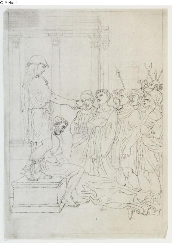 On the left, a figure standing on a pedestal and speaking to armed warriors in ancient garb. Sitting on the pedestal is a curly-haired man with a body lying on a stretcher at his feet.