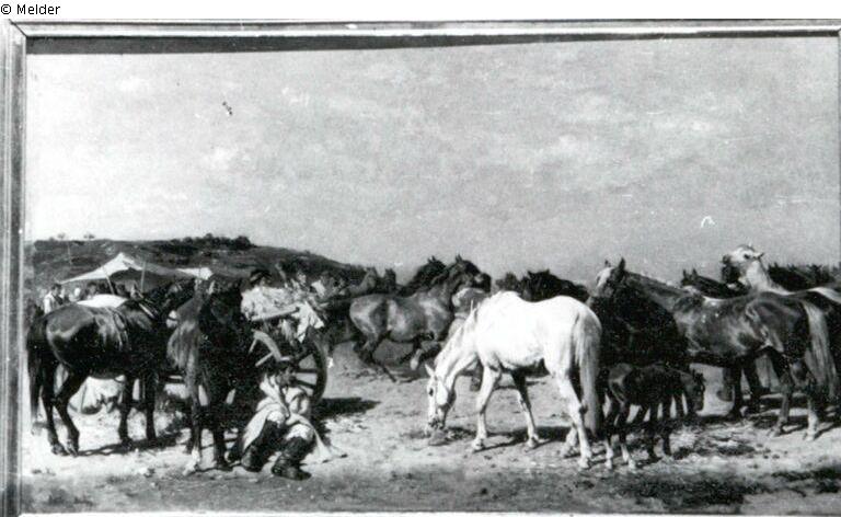 Signatur: Julius von Blaas/1880; Links Fahrzeug mit zwei Pferden und sitzendem Bauer, re. Schimmel und Pferde. Mitte vorbeigeführ-te Perde und reiche Staffage.