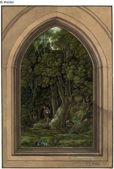 A hunter steps out of a forest thicket into a small clearing.
