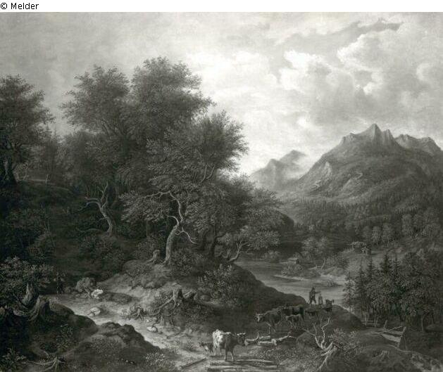 Found-Object Report | Object report Mountain landscape with three figures and cows in Lost Art-ID219657 Previous Next Artist / Creator Dorner, Johann Jacob (der Jüngere) (?) Birth 1775.07.07, München Death 1852.12.14, München Artist / Creator Dorner, Johann Jakob (der Ältere) (?) Birth 1741.07.18, Ehrenstetten (Breisgau) Death 1813.05.22, München TitleMountain landscape with three figures and cows inObject typePaintingGroup of reported objectsPaintingMaterial / TechniqueOil ; Canvas / painted Height 61.50 cm Width 76.00 cm Inventory numbermü3676Description Vor bewaldeter Hügellandschaft li.Weg nach li., auf den im Winkel re.anderer Weg stößt,auf dem Herdegetrieben wird.Rechts Ausblick auf Hochgebirge; davor vereinzelt Hütten. Read more Read less Holding Kulturgüter aus dem ehemaligen ReichsvermögenPublished since2001 Contact Kunstverwaltung des Bundes Herbert-Bayer-Straße 5 13086 Berlin Germany E-Mailprovenienzforschung@kvdb.bund.deHomepagehttp://www.kunstverwaltung.bund.de