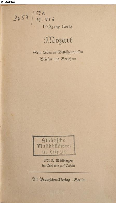 Hardcover, cloth binding, foil-stamped, bookplate of Leipzig City Library, loan slip with last entry dated February 25, 1991, stamp of Leipzig Municipal Music Library, deleted accession number of Leipzig City Library, stamp of Leipzig City Library, stamp of Henri and Martha Hinrichsen Foundation