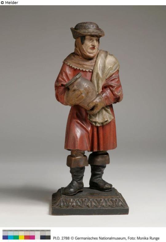 Peasant with pot in gloved hands. Clothing: Red body skirt, brown cowl and dark brown hat. He is wearing peasant boots and a white sack over his shoulder. The number 1587 is engraved on the underside, which is decorated with a leaf ring.