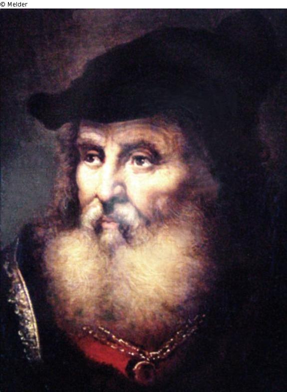 Portrait of a wealthy and well-established man aged about 50. He wears a remarkable golden collar and a black barret.