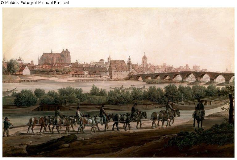 View of the city in the evening light from across the Danube towards the south-west, depicted from Niedermünster in the east to St Oswald in the west. In the right half of the picture the wide Stone Bridge, cut off by the edge, with the cathedral dominating on the left. In the foreground an overgrown sandbank, in front of it a side arm with barges. On the bank on this side salt train with mounted drivers.