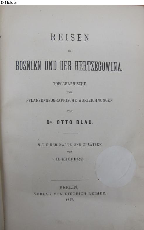 Found-Object Report | Object report Reisen in Bosnien und der Hertzegowina. Topographische und pflanzengeographische Aufzeichnungen Lost Art-ID623450 Previous Next Author Ernst Otto Friedrich August Blau Publisher Reimer TitleReisen in Bosnien und der Hertzegowina. Topographische und pflanzengeographische AufzeichnungenPlace of releaseBerlin Date of publication1877Object typeBookGroup of reported objectsLibrary objectsSignatureW 02/1050Description 8°, on cover handwritten ownership note Hrabak N. Sad and Ex. L. B. N. 25, stamp cut from title page Read more Read less Provenance Suspicion of looted property, Fritz Valjavec, 1966 Südost-Institut Munich (Valjavec estate) Read more Read less Published since08.10.2024 Contact Leibniz-Institut für Ost- und Südosteuropaforschung Bibliothek Landshuter Str. 4 93047 Regensburg Germany Homepagehttps://leibniz-ios.de/bibliothek/ueber-die-bibliothek Contact Tillmann Tegeler, M. A.PositionArbeitsbereich Bibliothek und elektronische Forschungsinfrastruktur Leiter des ArbeitsbereichsE-Mailtegeler@ios-regensburg.de