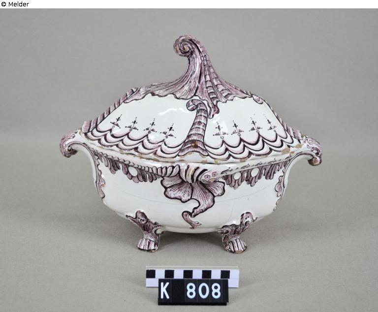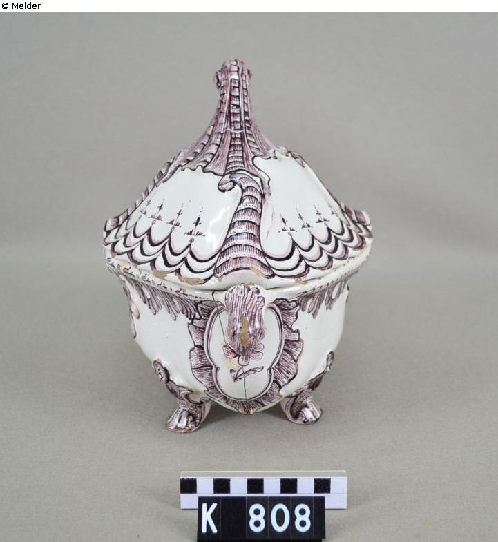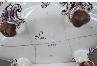 Terrine in rococo form with relief and rich movement and shell lid. Manganese violet painted and with mark on lid and base: three "C" resp. crescents (mark of the faience manufactory Hannoversch-Münden, which refers to the three crescents in the coat of arms of the von Hanstein family) above a horizontal line, below "B4" (painter's mark). Torn several times.