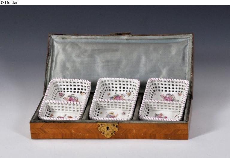 Three play baskets in a wooden case