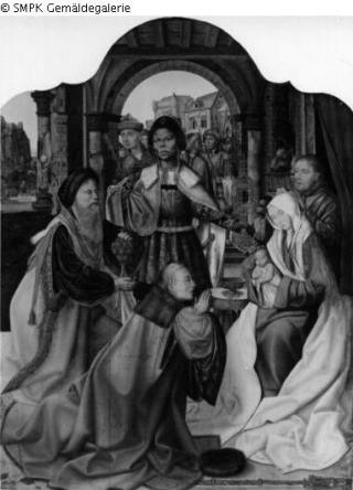 Panel painting: Depiction: the adoration by the Magi: they offer their gifts (gold, frankincense and myrrh) to the Christ child; adoration; gift; gold; gold(s); frankincense; myrrh; offering; spice