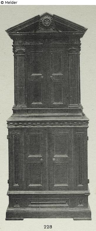 Nut wood, carved. The top-part is half-deep as the lower part of the cabinet. Both double-doors; doors and side walls with smooth rectangular panels framed with moulded slat edges. The upper part in front and at the sides with grooved pilasters. The ledge as an open peaked gable with bead and reel and dentils. At tympanum the carved emblem of Medici. Formerly property of emperor. Source: Hugo Helbing Kunsthandlung and Kunstversteigerungshaus: Kunstbesitz eines Berliner Sammlers. Katalog Nr. 49; Math. Lempertz'sche Kunstversteigerung: Eine bekannte Süddeutsche Privatsammlung and anderer Privatbesitz, Katalog Nr. 395.