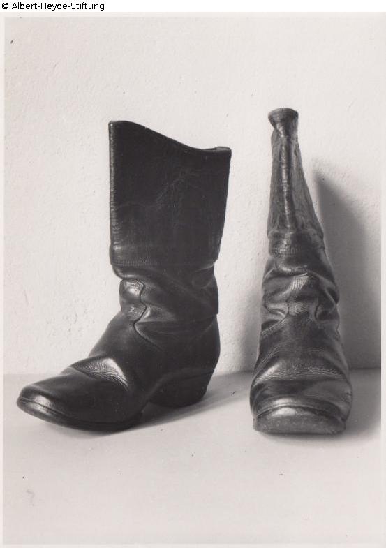 Pair of heavily worn, mid-calf boots with wooden nailed soles.