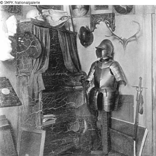 Panel painting: Depiction: Workshop, artist's studio (in general) & workshop utensils, studio utensils (of the artist) & armour, armour & helmet & cutting and thrusting weapons: sword & furniture for storage of objects & palette.