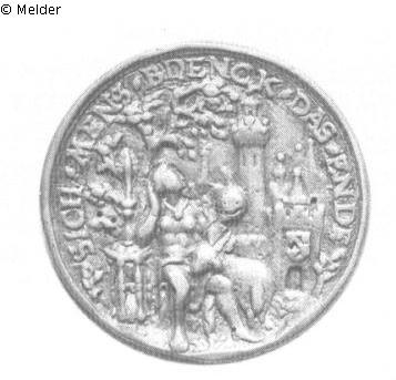 Medaille. Vs.: Christus am Kreuz mit drei Figuren. Umschrift zwischen Linienkreisen: ET EGO SI EXALTVS FVERO A TERA OMNIA TRAHAM AD M (...). Im Feld oben: IO 1Z ?Rs.: Allegorie der Vergänglichkeit: Eine weibliche Figur sitzt unter einem Baum vor einer Stadt mit Türmen und einem Stadttor. In der linken Hand hält sie einen Schädel, und den rechten Arm stützt sie auf eine Sanduhr, auf der ein Leuchter steht. An ihr Bein schmiegt sich ein Lamm und legt seinen Kopf in ihren Schoß. Umschrift: SICH MENS BEDENCK DAS ENDE.Vorder- und Rückseite sind von verschiedener Hand, die letztere stammt von der Lotter-Medaille Reinharts von 1544 (Nr. 373-375).