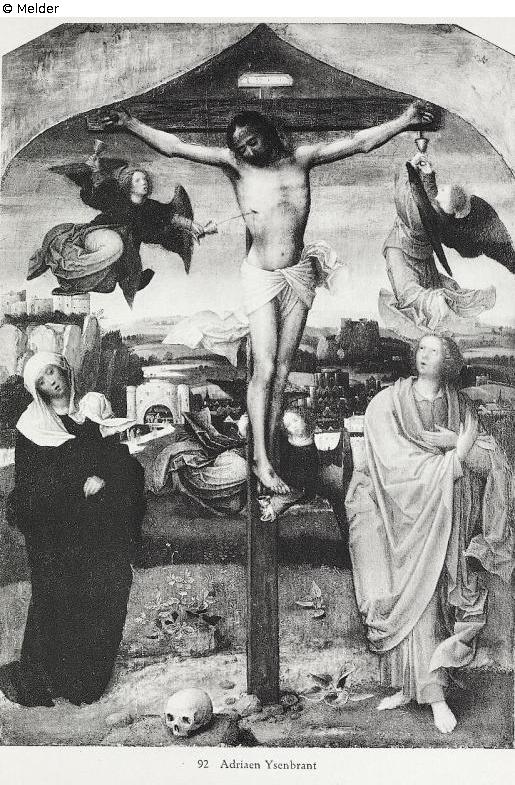 In center the crucifix. At the right John in a red garmlet and overcoat looking up to Jesus Christ, at left side Mary with white headscarf and darkblue overcoat. Above John, Mary and cruxifix three flying angels in coloured robes, who're catch up the blood of Christ with goblets. In background scenery of town, lakes and fortresses on rocks. Rambled on top an gold-plated at the corners (subsequent). Wooden frame. At backside burned owner stamp: D. G. H. below crown. Discussed and depictured at Max J. Friedländer: Die altniederländische Malerei, elfter Band, S. 133, Abb. Tafel LXV, Nr. 158. Source: Hugo Helbing Kunsthandlung and Kunstversteigerungshaus: Kunstbesitz eines Berliner Sammlers. Katalog Nr. 49.