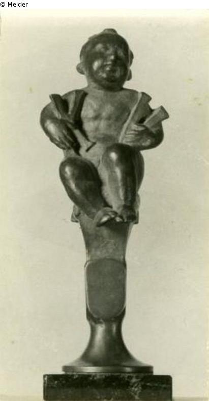 A winged putto with his legs drawn up sitting on a top, in the arms holding the initials K.V. of the artists' association. Design for an anniversary of the Kunstverein (1928).