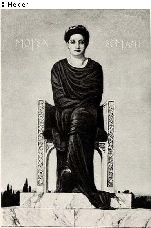 Auf einem skulptierten Marmorthron, zu dem mehrere Stufen führen, sitzt in Schwarz gehüllt die Muse mit Lorbeerkranz gegen den Tiefblauen Himmel, in welchem die inschrift ΜΟΥΣΑ ΣΕΜΝΗ steht. Landschaft in der Ferne. Goldener Rahmen.