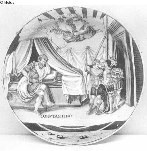 AN URBINO DISH ON FOOT, by Fra. Xanto Avelli, of shallow shape, with slightly everted rim, painted in brilliant enamels with the Dream of Constantine, who is depicted seated by a bed dreaming, the angel appearing to him with a cross and bearing on a banner " IN HOC SIGNO VINCES ", to the right soldiers and attendants holding his great sword, helm and shield, at the foot in black •' CONSTANTINO ", the underside inscribed " 1538. Del nobil Costati I'alta visions .X.", circa 1538