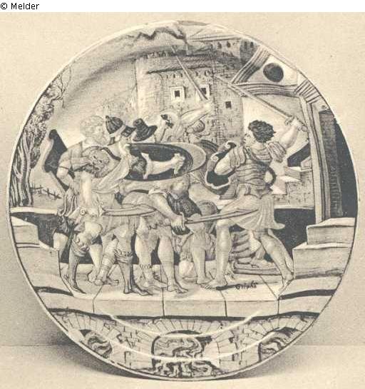AN URBINO DISH ON FOOT, by Fra. Xanto Avelli, brilliantly painted with Gryphon fighting the soldiery of Damascus on a bridge with a castle in the background, the figures in bright orange, yellow, blue and green, the reverse inscribed in black "Solo Gripho cotra Damasco tutto" and in red with the initials and date F.X.R. 1537, circa 1537