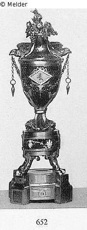 Goldbronze und dunkelgrünes Email, urnenförmiges, rundes Gefäß, getragen von vier Delphinen, auf reich gegliedertem Sockelunterbau, auf dem Deckel Blumenstraußbekrönung und zwei sitzende Adler, die Kettchen halten, in den Emailflächen fein ziselierte, zum Teil farbig emaillierte Blatt- und Blütenzweige, Insekten und Perlreihen, Email zum Teil etwas beschädigt