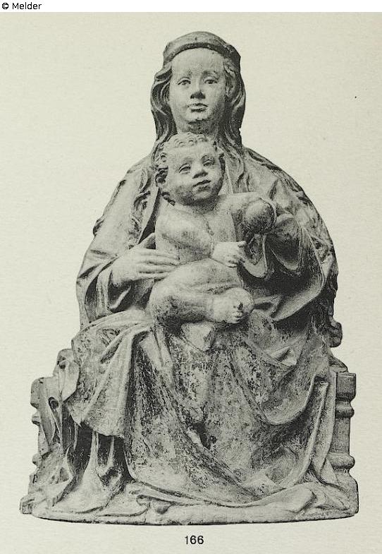Group of lime wood, hollowed at the back, old coating. Both in a straight frontal posture. The sitting mother is holding the nacked child on her lap, that helds an apple in its left hand. Relief-moulded bench, the garment in front of the thighs plenty draped. Long wavy hair. The garment with delicate moulded ornaments. Source: Hugo Helbing Kunsthandlung and Kunstversteigerungshaus: Kunstbesitz eines Berliner Sammlers. Katalog Nr. 49; Math. Lempertz'sche Kunstversteigerung: Eine bekannte Süddeutsche Privatsammlung and anderer Privatbesitz, Katalog Nr. 395.