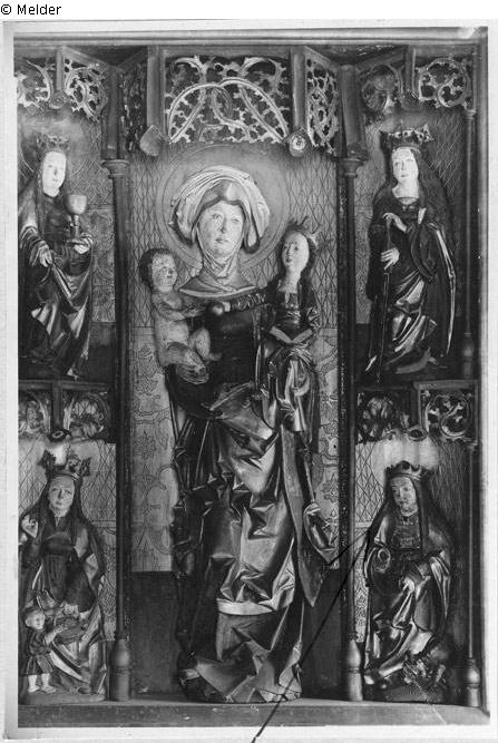 Es fehlen die rechten Nebenfiguren vom Schrein: Hl. Katharina (rechts oben), Hl. Margaretha mit dem Drachen (rechts unten) und alle 8 Heiligenfiguren der Flügel (Martin, Elisabeth, Antonius, Nonne, Jakobus, Ursula, Urban, Apollonia)