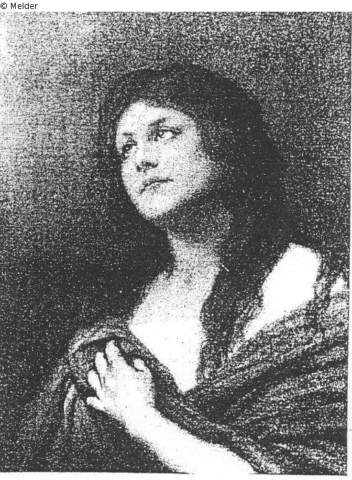 with blue-grey robe, the left hand laid on the chest, the gaze directed upwards; signed