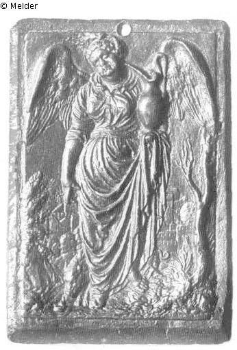 Rechteckige Plakette, oben in der Mitte eine Durchbohrung. Die Gefräßigkeit als geflügelte, beleibte Frau steht vor einer Landschaft mit den Gebäuden einer Stadt im Hintergrund. Sie ist in ein langes Gewand gekleidet und hält in der Linken eine Kanne. Hinter ihr erscheint ein Schwein, das an einem Kothaufen riecht. Die Plakette gehört zu der Folge der sieben Todsünden.