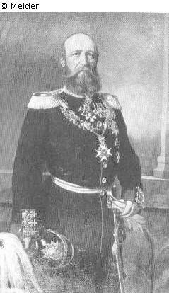Knappes Kniestück vor einer Wand mit Sockel, Dreiviertelporträt nach links, Kopf und Blick zum Betrachter gewendet; Vollbart mit weit nach außen gedrehtem Oberlippenbart; Uniform mit zahlreichen Orden am Hals und auf der linken Brustseite, großer sternförmiger Orden an einer Kette auf der Brust; linke Hand die Handschuhe haltend am aufgestützten Säbel; rechte Hand hält den mit weißem heranhängenden Federbausch geschmückten Helm.; Signatur: Pauline Soltau 1879; Maße: 137,5 x 94 cm