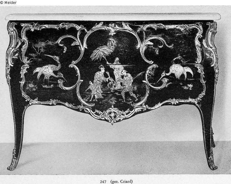 Louis XV. Leicht gebauchte und geschweifte Form mit zwei Schubladen und weißer Marmorplatte, auf den Seiten- und der Vorderfläche Gold-, Silber- und farbig gehöhte Chinapanneaus, die eingefasst sind von elegant geschweiften, stark gegliederten Goldbronzerahmen in Rocaillen- und Blattformen, entsprechende Eckbeschläge und Schuhe, Stempel: M. Criard;