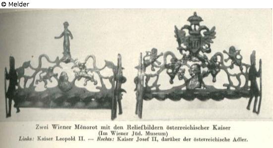(According to 'Jüdisches Lexikon') bench-shaped body, with eight light fixtures, a portrait bust of Joseph II on the rear panel, flanked by two rearing lions. Toped by the crowned Imperial Eagle of Habsburg.