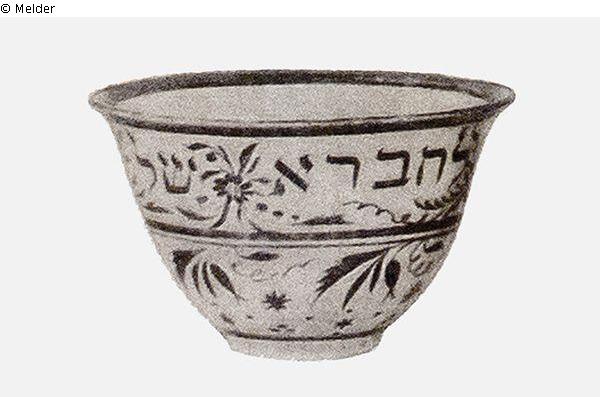 No handle, no mark. White with gold painting and Hebrew inscription: "Lechevroh schel tikum chazott" [Lakhevra shel tikun chatzot].