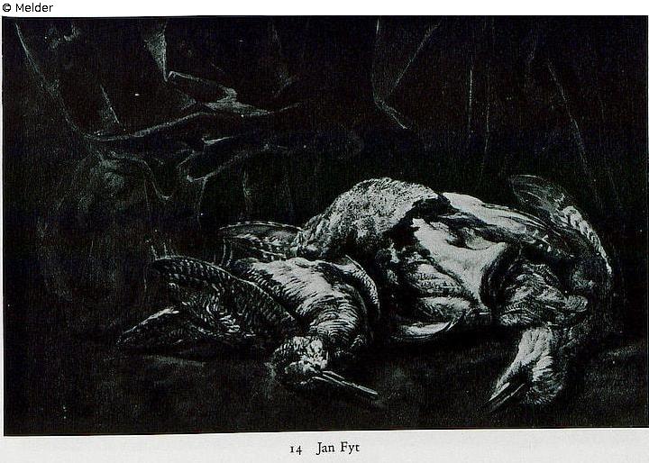 Three killed wild birds with colorful plumage lying on green soil in front of wine red curtain. On the right: Joannes Fyt.