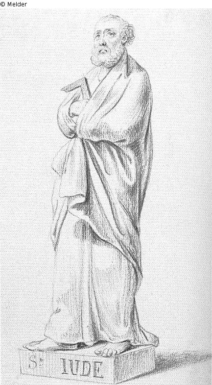 Vierzig Entwürfe zum bauplastischen Figurenprogramm am Französischen Dom zu Berlin; Alte Inv.Nr. 856/1934; Blatt 1-38 derzeit in Berliner Privatbesitz; Blatt 27-31 Entwürfe für Apostel als Nischenfiguren am Turmzylinder: sechs Figuren geplant; Blatt 28 Bez.: St. IUDE