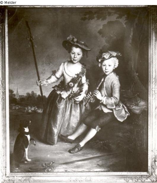 In Landschaftlicher Umgebung, mit weidenden Schafen im Hintergrund. Beide Kinder in ganzer Figur; das Mädchen stehend. Mit blauem Band geputzter schlosstaille rosa Rock, gelber Hut mit blauem Band ; über den Schultern gelegt e. Blumenranke. In der einen Hand Kirschen und Weintrauben, in der anderen eine Schäferschippe. Der Junge mit einer Flöte in blauem Rock, weißer Weste, brauner Hose, braunem Halbschuhen, hellblauem und rosa verziertem Dreispitz sitzt unter einem Baum. Links ein kleiner schwarz-weißer Hund mit rotem Halsband. Im Vordergrund eine zweite Schäferschippe mit Bandschleife auf der Erde liegend. In Holzrahmen (Rahmenmaße (h xb ): 160 x 184) Neuerwerbungen des Märkisches Museum. Kulturgeschichtliche und stadtgeschichtliche Erwerbungen Herbst 1933 bis Weihnachten 1934 XI, Berlin 1935, S. 28, Abb. 19