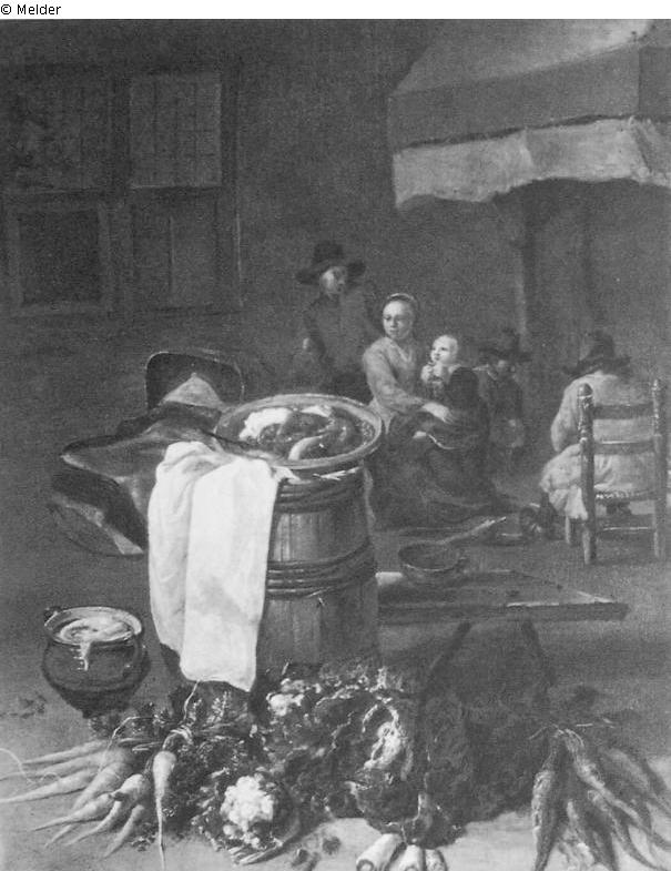 Farmer's kitchen, a barrel, bowl with sausage, pot with lard, cabbage, carrots and other vegetables in the foreground, on the right back three men and woman with child in front of a fireplace; on back Label with Inventory no. and Seal