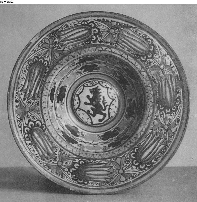 Mit breitem Flachrand und vertiefter Mitte. Farbig bemalt. Im Spiegel Wappen mit steigendem Löwen. Auf der Wandung blaugelbe Weinblattborte in Nachahmung spanisch-maurischen Dekors; auf dem Rand ein Kranz großer blauer Blüten mit grüngelben Spitzen und manganfarbenen Kelchblättern, in rankengefüllten Ovalen. An den Schnittpunkten dieser ovale grüngelbe Kelchmotive. Auf der Rückseite blaugelber Weinblattfries zwischen konzentrischen blaugelben Ringen. In der Mitte blaue Marke: "N" ( Weinmüller: Tiefer Fond, flacher Rand. Dekor: Tulpen, Blattornamente