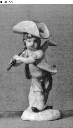 Er steht leicht vornübergeneigt und hält mit beiden Händen den Stiel des geschulterten Dreschflegels. Er trägt einen großen, blaubordierten weißen Hut mit breiter aufgeschlagener Krempe und violettem Band, gelb gefüttertes weißes Jäckchen, rosaviolettes Höschen und rotbraune Holzpantinen. Leib und Beine sind bloß. Der runde Sockel und die Stütze sind weiß. Blaumarke Schwerter.
