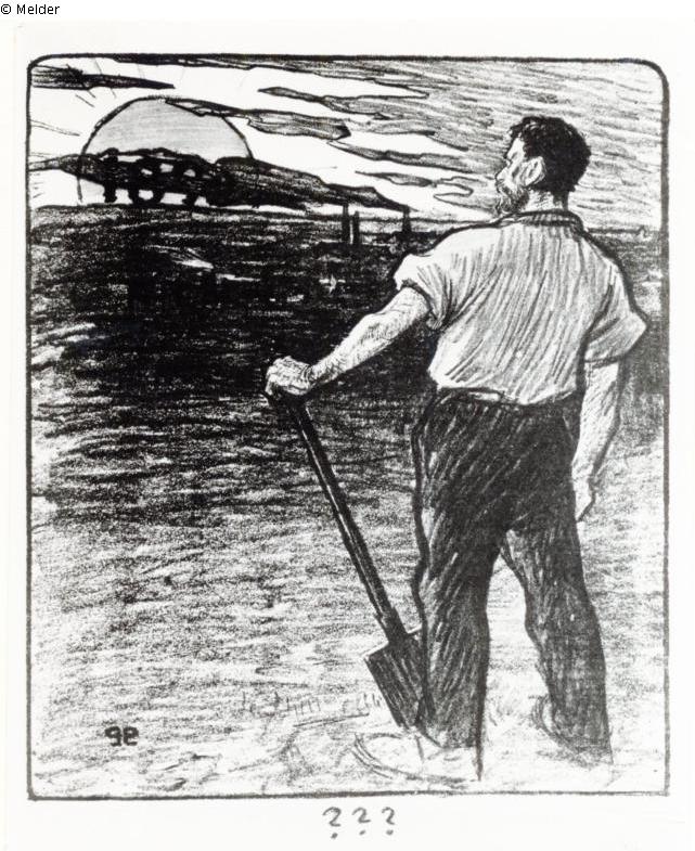 "Mit dem Rücken zum Betrachter schaut ein bärtiger Arbeiter mit hochgekrempeltem Hemd einem Sonnenaufgang zu. Das ist eine interessante Komposition, denn dadurch nimmt der Betrachter die gleiche Perspektive ein (Solidarisierung des Lesers). Das Naturspektakel ist für ihn voller Symbolik: Leuchtend rot strahlt das Gestirn und auf der Sonne steht die Zahl 1894. Was wird im neuen Jahr auf die Arbeiterbewegung zu kommen? Sich seiner Kraft bewusst, stützt er sich auf einen Spaten und er schaut in Richtung der Fabrikschlote, die mit dichtem Rauch die Sonne verdunkeln. Unter ihm drei Fragezeichen – was wird die Zukunft bringen." (UW)