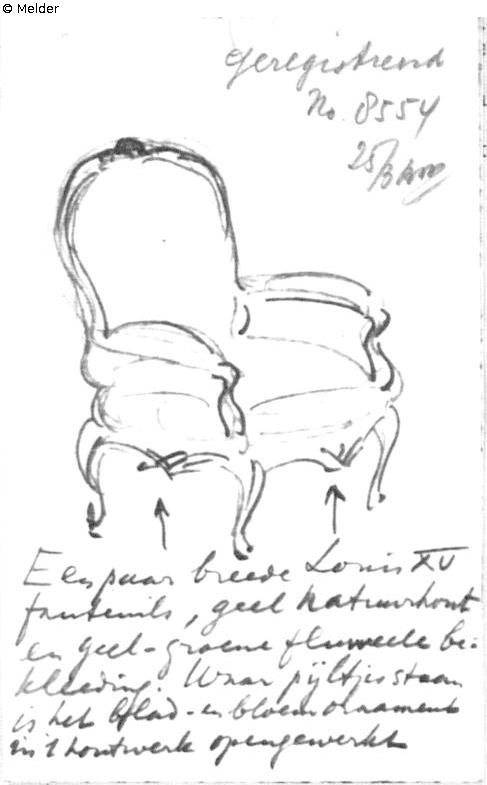 source: Algemeen Politieblad van het Koninkrijk der Nederlanden, Jg. 95, Nr. 34, 30. November 1946 publizierten Liste 719 „Te ‘s-Gravenhage ontvreemd in 1943/1944, hollandsche teekeningen, t. w.“; Intern Aangifte Formulier vom 25.3.1946, BArch Koblenz B 323/2 fol. 150 mit eigenhändiger Skizze von F. Lugt