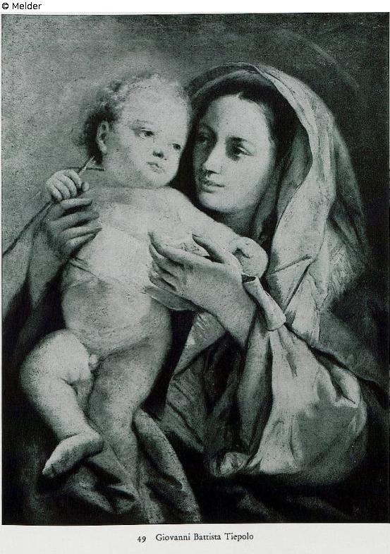 Life-size half figure in a red dress, blue coat and chamois-colored headscarf. She lays a white bandage around the chest of the naked, struggling child who is lifting her up. This holds a peach in the left, a small pipe cross in the right.