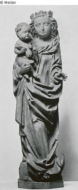 auf der Mondsichel stehend, in langem Gewand, den Mantel mit dem rechten Arm, auf dem das Kind mit einem Vogel spielend sitzt, vor dem Leib gerafft, langes offenes Haar, Rückseite ausgehöhlt, Lindenholz abgelaugt