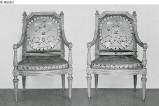 Sofa und vier Sessel im Louis XVI.-Stil, weißlackiertes Holz mit gesticktem Seidenbezug, profilierte und geschnitzte Gestelle, kannelierte Säulenbeine, die leicht nach außen, ausladenden Armstützen ruhen auf geschnitzten Säulchen, auf den Lehnen geschnitzte Pinienzapfen als Zierate