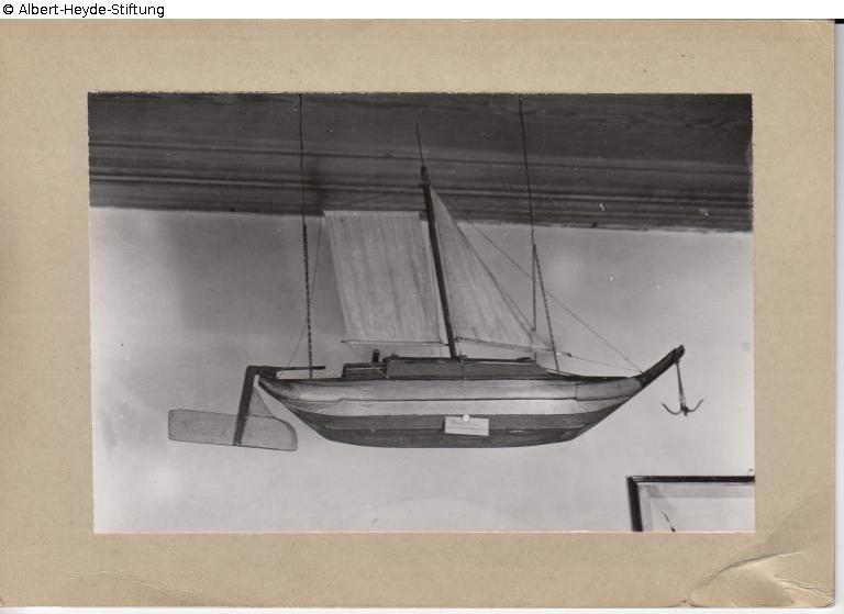 Model ship from the ‘Gasthof zum goldenen Schiff’ (Golden Ship Inn), the meeting place of the Guben boatmen. It depicts a gaff-rigged (!) coffee barge (Neisse barge) with a pole mast, mainsail and foresail.