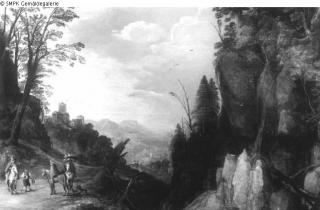 Panel painting: Depiction: Mountains & riding on a horse, donkey, mule, etc.; rider(s); mountain & riding; riding (on horseback); donkey; mule